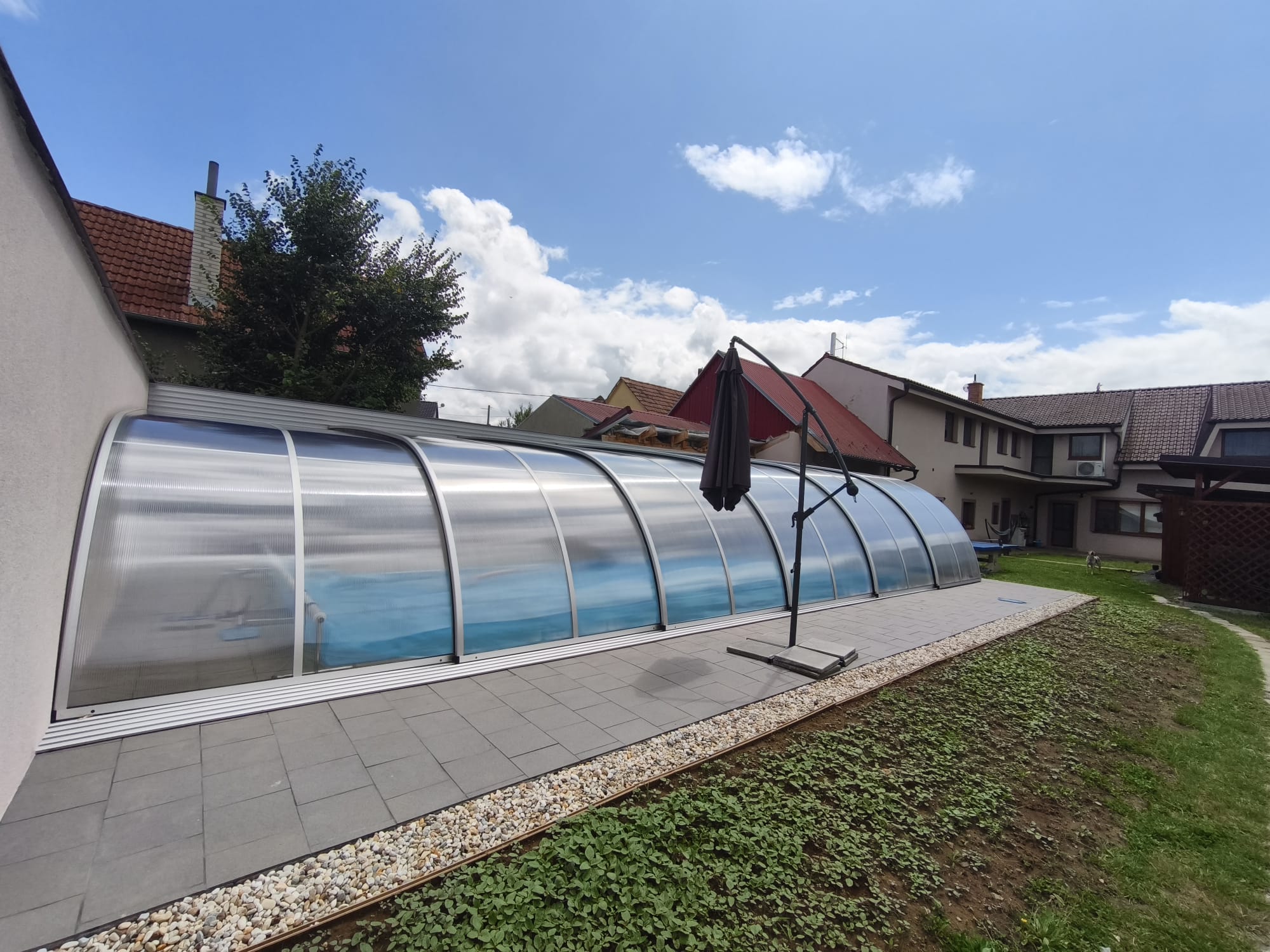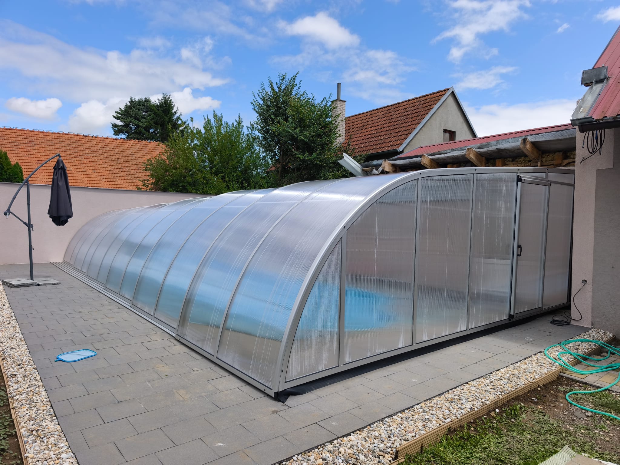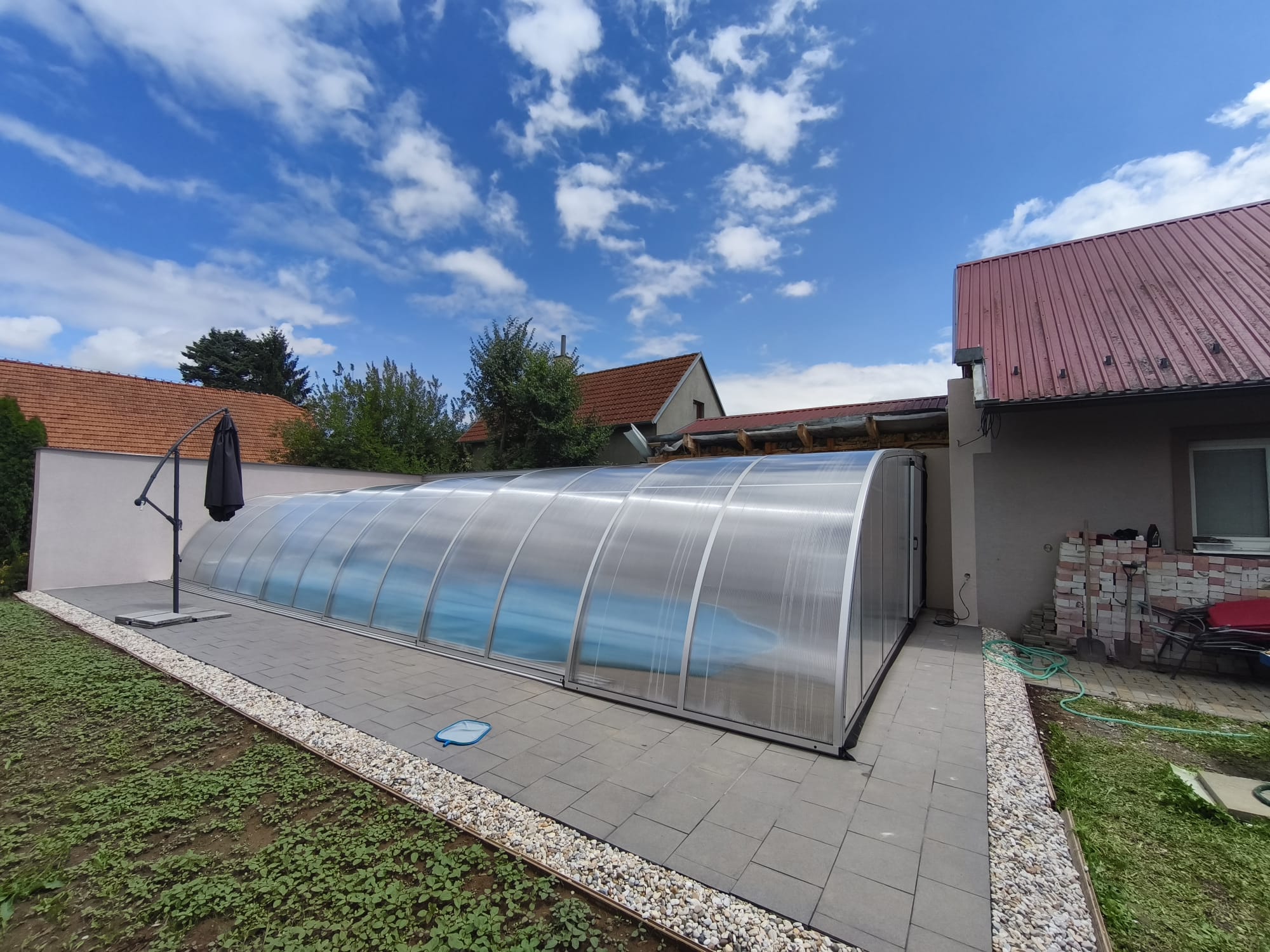 Toto zastřešení je ideální pro ty, kteří hledají prostorově efektivní řešení pro svůj bazén, které maximálně využije dostupného místa a výšky. Elegantní design a kvalitní materiály zajišťují dlouhou životnost a bezproblémovou funkčnost po mnoho let.
