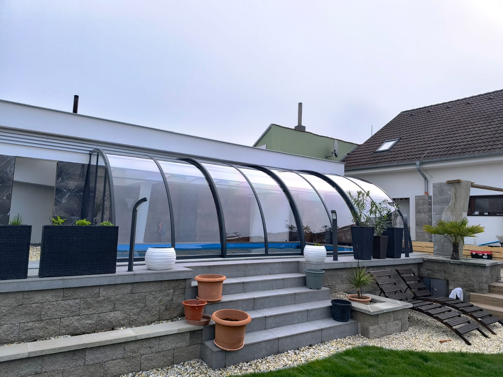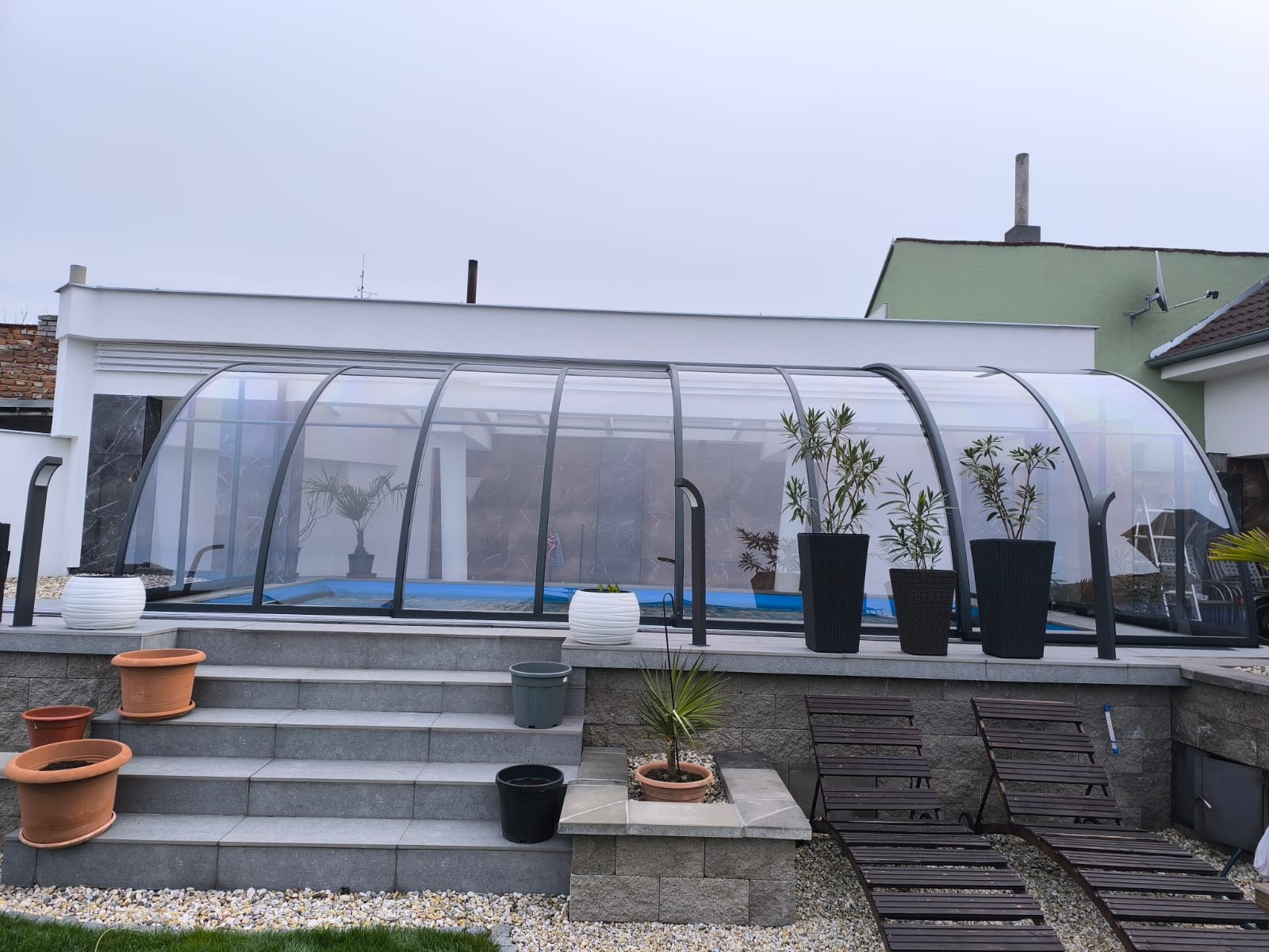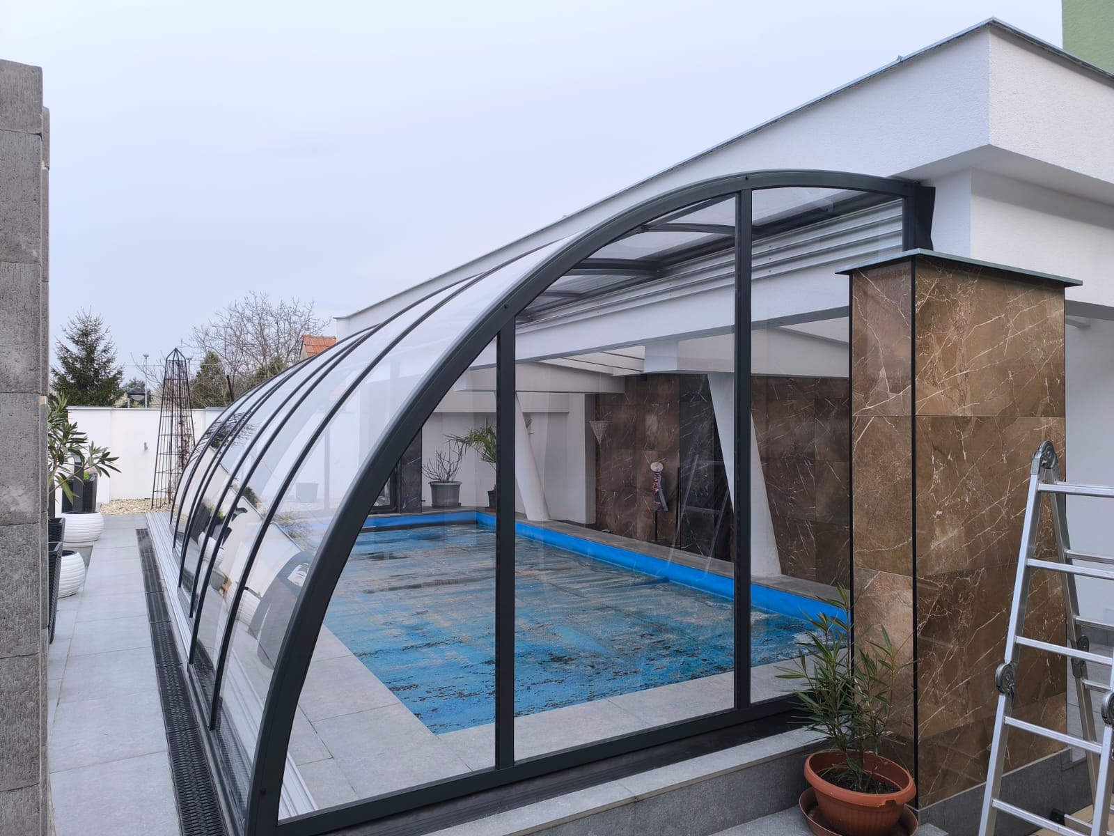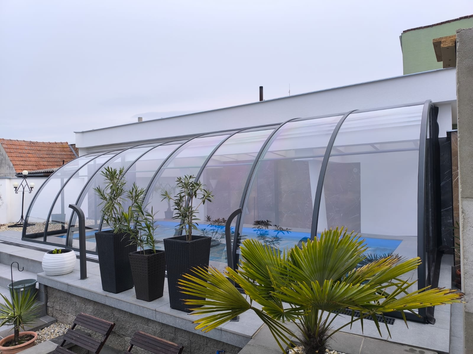Toto zastřešení je ideální pro ty, kteří hledají prostorově efektivní řešení pro svůj bazén, které maximálně využije dostupného místa a výšky. Elegantní design a kvalitní materiály zajišťují dlouhou životnost a bezproblémovou funkčnost po mnoho let.