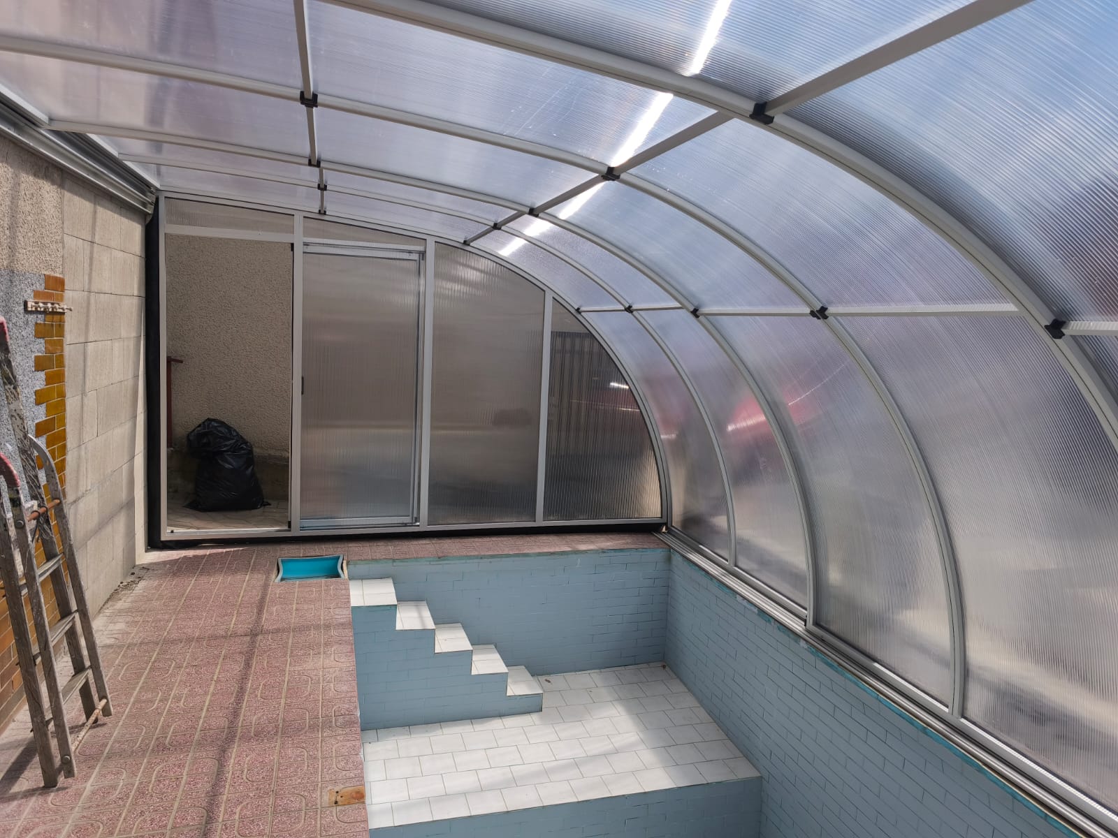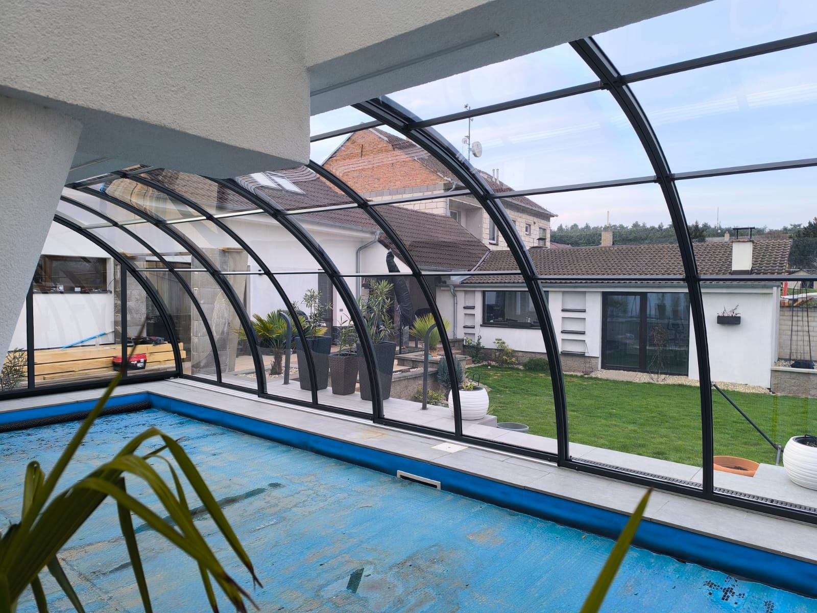 Toto obloukové jednou zatočené bazénové zastřešení využívá nosné zdi nebo konstrukce pro efektivní maximální využití prostoru a výšky u vašeho bazénu.